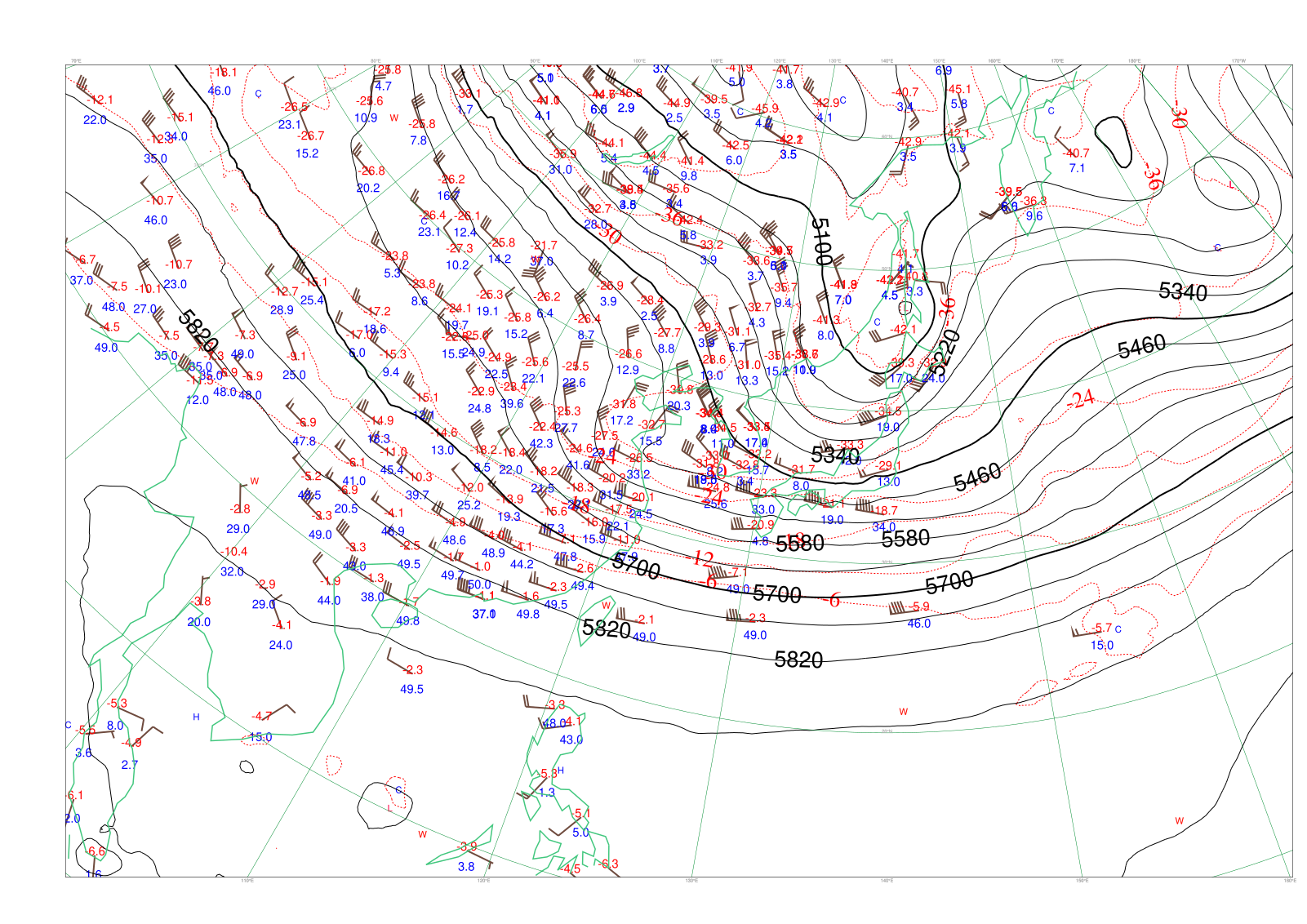 - プロット:高層観測(500hPa)。矢羽は風、赤字は気温、青字は湿数。