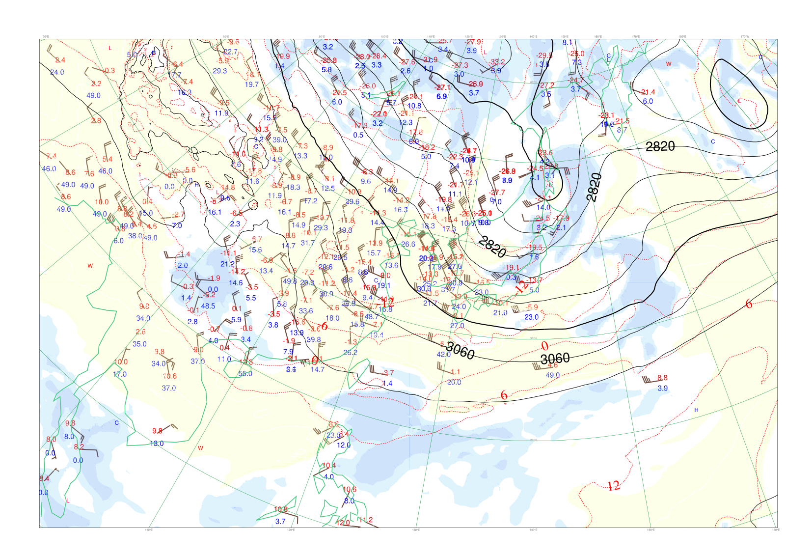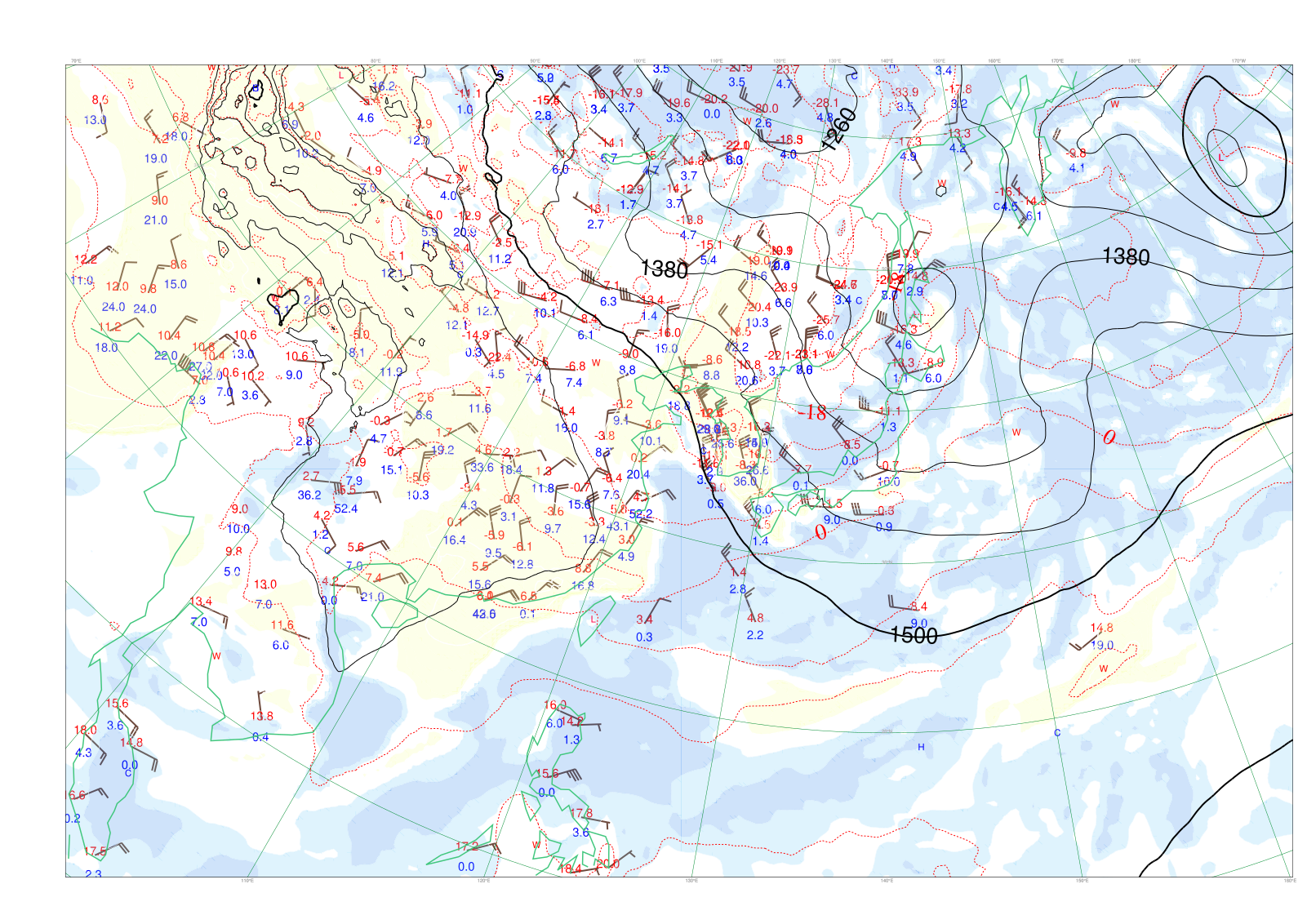 - プロット:高層観測(850hPa)。矢羽は風、赤字は気温、青字は湿数。